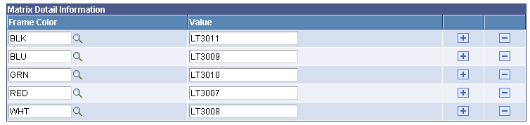 Note. Once you click the Go to Matrix Detail link and save the matrix header information that you define, the resulting matrix details are tied to the matrix header key fields, which are then frozen; only the operator can be edited. To change a matrix header key at this point, you must create a new matrix variable.