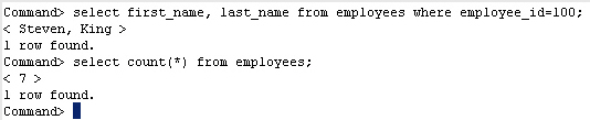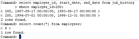 select count(*) from employees;d. 子のキャッシュ表に対してWHERE句の問合せを実行すると、子と親の両方のレコードがキャッシュ・データベースにロードされます。 select employee_id, start_date, end_date from job_history where employee_id=200;