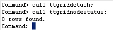 a. この手順は、データベースがキャッシュ・グリッドに現在アタッチされている場合にのみ実行する必要があります。組込みのttGridDetachを使用して、データベースをデタッチします。 call ttgriddetach; b. プロシージャttGridNodeStatusを使用して、cachedb1がキャッシュ・グリッドにアタッチされていないことを確認します。 call ttgridnodestatus;