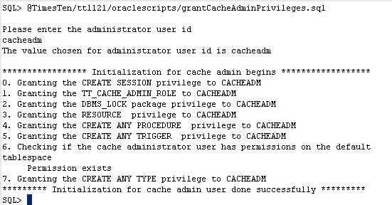 a. スクリプト<TimesTen_install_dir>/oraclescripts/grantCacheAdminPrivileges.sqlを実行して、必要な権限をキャッシュ管理ユーザーに付与します。キャッシュ管理ユーザーの名前を入力するよう求められます。プロンプトでcacheadmと入力します。 @TimesTen/tt1121/oraclescripts/grantCacheAdminPrivileges.sql