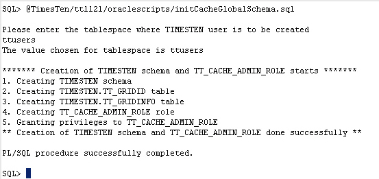 a.<TimesTen_install_dir>/oraclescriptsディレクトリにあるスクリプトinitCacheGlobalSchema.sqlを実行して、Oracle DatabaseにTimesTenスキーマを作成します。 ユーザーTimesTenのデフォルトの表領域を入力するよう求められます。プロンプトでttusersと入力します。 @TimesTen/tt1121/oraclescripts/initCacheGlobalSchema.sql