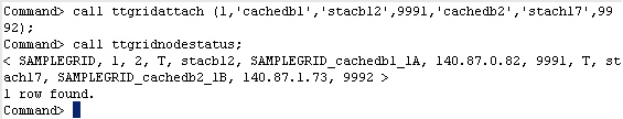 a. 手順9は、キャッシュ・データベースにグローバル・キャッシュ・グループが存在する場合にのみ実行する必要があります。プロシージャttGridAttachをコールして、キャッシュ・グリッドに現行のスタンバイ・キャッシュ・データベースを追加します。 call ttgridattach (1,'cachedb1','stacb12',9991,'cachedb2','stach17',9992); b. プロシージャttGridNodeStatusを使用してアタッチされているすべてのグリッド・メンバーをリストし、キャッシュ・グリッドsamplegridにcachedb1_1121が参加したことを確認します。 call ttgridnodestatus;
