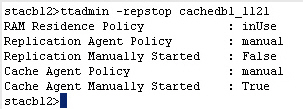 インスタンス管理者としてサーバー1(stacb12)にログインし、ttAdminユーティリティを使用して、cachedb1_1121でレプリケーション・エージェントを停止します。ttadmin -repstop cachedb1_1121