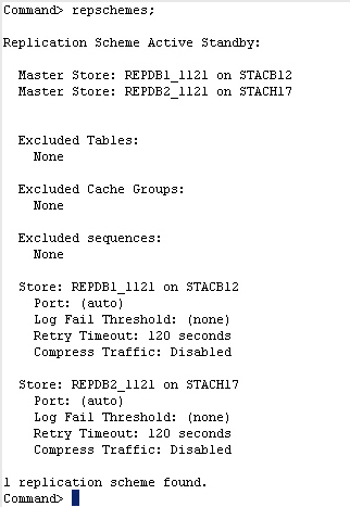 ttIsqlコマンドrepschemesを使用すると、データベースにデプロイされている現在のレプリケーション・スキームを確認できます。 |