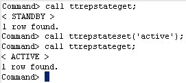 組込みプロシージャttRepStateSetを使用して、現行のデータベースをアクティブ・スタンバイ・ペアの新しいアクティブ・データベースとして指定します。次に、組込みプロシージャttRepStateGetをコールして、現在のレプリケーション状態を確認します。 |