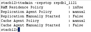 障害が発生したデータベースで、レプリケーション・エージェントがまだ停止されていない場合は停止します。インスタンス管理者としてサーバー1(stacb12)にログインし、ttAdminユーティリティを使用して、repdb1_1121でレプリケーション・エージェントを停止します。 |