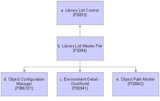 The Library List Control table and the Environment Master table have a direct correlation. For each environment listed as a valid user environment in the F0093, there is one F0094 record that provides the name and description of that environment. The F986101 and F00941 and F00942 provide additional information for each of the environments defined in the Environment Master table (F0094).