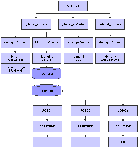 The STRNET command runs the master NETWORK (JDENET_N) job in a newly started subsystem. The jdenet_n Master process spawns jdenet_n slave and jdenet_k processes (also called kernels) at startup or as they are needed. JD Edwards EnterpriseOne uses a number of different types of kernels to handle different types of processing, even though all of these have the same process name in the operating system (jdenet_k). The definitions for the number of processes to start and what types to start are stored in the jde.ini file.