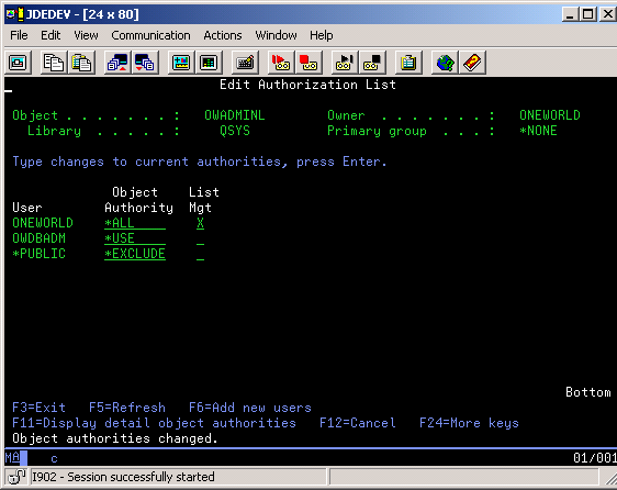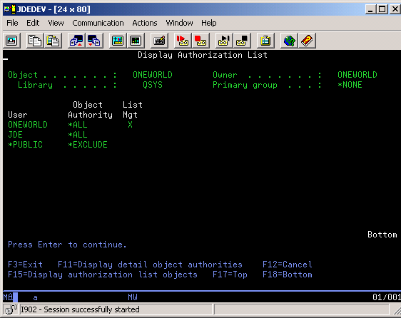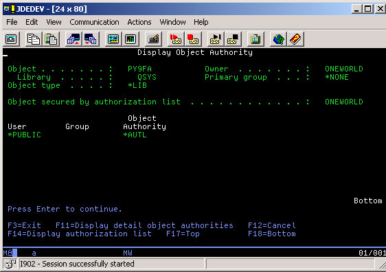 Similarly, if you set up multiple instances of JD Edwards EnterpriseOne and you display object authority, the value that appears is the name of the user profile for all objects except the SYSTEM library. The object authority for the SYSTEM library when you run multiple instances of JD Edwards EnterpriseOne is the name of the Admin. Authorization List. If you set up a single instance of JD Edwards EnterpriseOne, all objects are secured by the authorization list, except the SYSTEM library, which is secured by the OWADMINL authorization list.