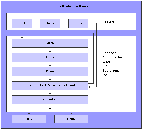 The winemaking process requires ongoing quality assurance activities. You use the EnterpriseOne Quality Management system to set up test definitions, test result names to group similar tests with different test definitions, and test panels to group tests that are performed together. You also set up equipment and consumable material that are needed to perform tests.