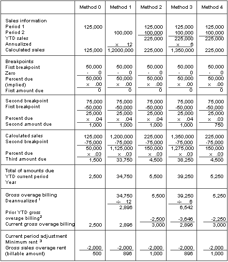 The sample calculations for the first five methods are based on the following information for a product sale record. The gross sales-overage rent is calculated for the second period except for the weekly billing, which only accounts for sales for period 1.