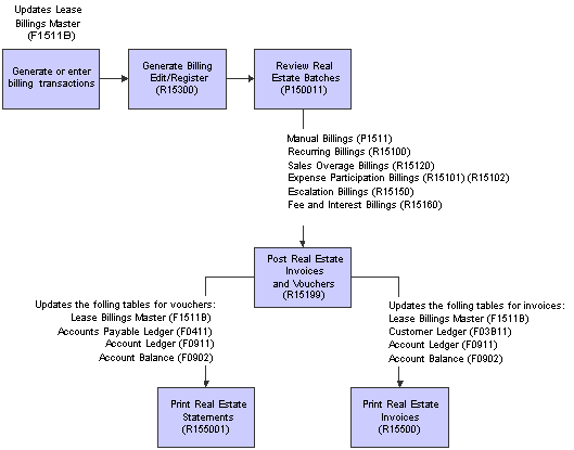 This process flow illustrates the associated billing process used in the JD Edwards EnterpriseOne Real Estate Management system: