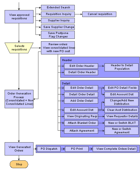 For most requisitions, you can create purchase orders by using the Batch Requisition Consolidation program. You can run this batch program several times a week. It creates purchase orders for all approved requisitions. For the requisitions that require buyer intervention, use the Requisition Expeditor program. This program enables the buyer to manage requisitions that become exceptions, such as high priority items, items for which a supplier must be assigned, or items for which the cost must be changed.