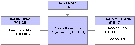 To process retroactive adjustments, you update the appropriate rates and rules and then run the Create Retroactive Adjustments program (R48S781) to recalculate cost, invoice, and revenue amounts for selected transactions from the Workfile History Table (F4812H). The system creates a negative record in the Billing Detail Workfile table (F4812) to reverse the original record and creates a new record with the adjusted amounts. The adjusted records are eligible for costing, invoicing, and revenue using the existing functionality.