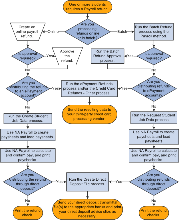 The following diagrams display the decisions and processes involved with creating and distributing payroll and AP refunds.
