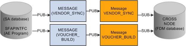 Sends voucher header, line, and distribution information in the message to be processed by PeopleSoft Payables. The system populates staging tables with the message data. The Voucher Build (AP_VCHRBLD) process then processes these staging tables. |