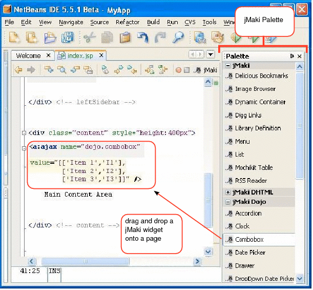 The NetBeans IDE 5.5.1 jMaki module makes it easy to drag and drop jMaki widgets onto JSP pages and to customize the widgets. When you create a page using the module, you have a choice of templates to use for the page. You can read about the templates and see what they look like by visiting the jMaki Layouts page.