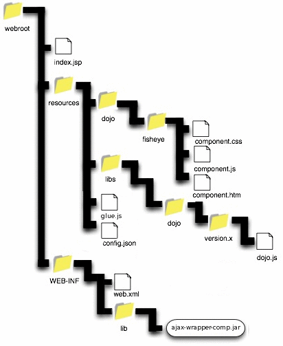 A jMaki application that includes a Dojo fisheye widget has the basic structure shown in the following figure, which illustrates where the various required resources fit into the application. As shown in Figure 3-1, the libs folder contains the third-party Dojo widget implementation code. NOT ANY MORE