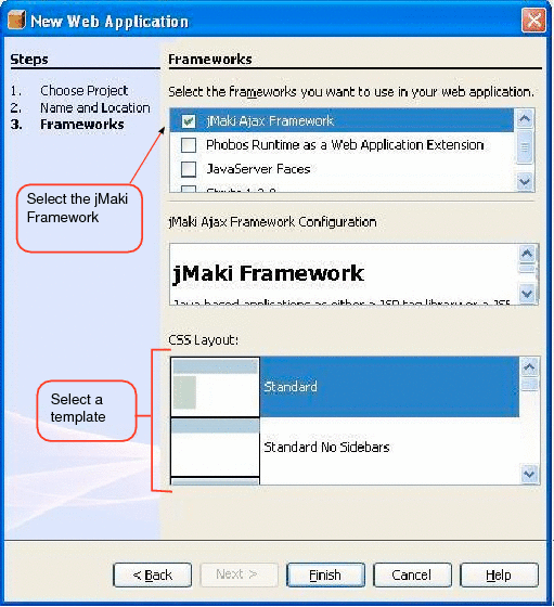 As shown in the preceding figure, to create a jMaki web application, you need to select the jMaki Ajax framework and select a template for the first page of your application.
