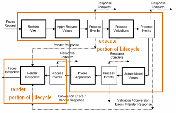 The execute part of the life cycle is executed during a postback. It includes the phases that handle data conversion, validation, and updating of the model object. The render portion, as its name suggests, renders the page as a result of a request for the page. For more information on the JavaServer Faces life cycle, please see The Life Cycle of a JavaServer Faces Page in Chapter 9 of the Java EE 5 Tutorial.