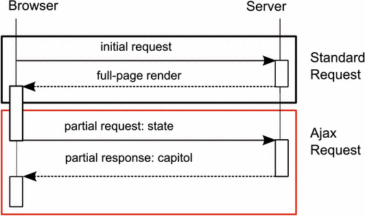 The server returns an Ajax response. Using the AsyncResponse instance, the PartialViewRoot constructs an Ajax response, which consists of some XML that contains the new value of the capital component, and sends the response to the client.