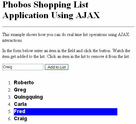 Because Phobos enables JavaScript on the server, your Phobos controller can send the list data back to the client in JavaScript form. In contrast, the servlet version of the AjaxList application described in Basic Ajax-Enabled Web Application renders the HTML on the server and writes it out to the client.