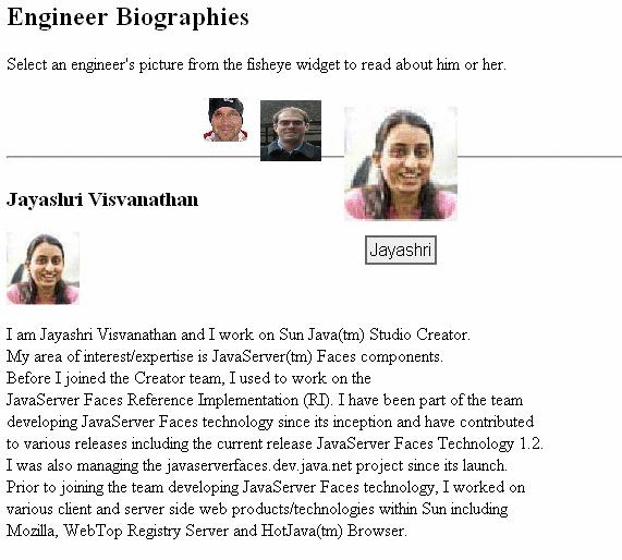 The bioFisheye example, located in swdp.tutorial.home/examples/phobos/, includes two views that each use a different jMaki widget to select a value. The fisheye.ejs view includes a jMaki Dojo Fisheye widget that allows you to select a photo of a Sun engineer. When you select a photo, the jMaki dContainer widget loads a page containing biographical information about the person shown in the photo. Figure 5-4 shows a screen shot of this view.