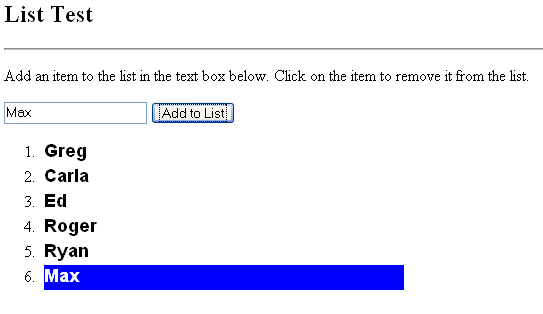 The AjaxList example allows you to add items to a list, remove items from a list, and display the list using Ajax. shows a screen shot of the application. As shown in Figure 2-2, you add an item to the list by entering it in a field and clicking the Add to List button. After you click the button, the item appears in the list. When you move your mouse over an item in the list, a blue highlighted bar appears over it, indicating that you can remove the item from the list by clicking it.