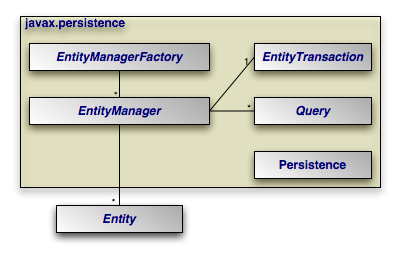A number of the depicted interfaces are only required outside of an EJB3-compliant application server. In an application server, EntityManager instances are typically injected, rendering the EntityManagerFactory unnecessary. Also, transactions within an application server are handled using standard application server transaction controls. Thus, the EntityTransaction also goes unused.