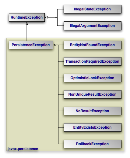 The diagram above depicts the EJB persistence exception architecture. All exceptions are unchecked. EJB persistence uses standard exceptions where appropriate, most notably IllegalArgumentExceptions and IllegalStateExceptions. The specification also provides a few EJB-specific exceptions in the javax.persistence package. These exceptions should be self-explanatory. See the Javadoc for additional details on EJB exceptions.