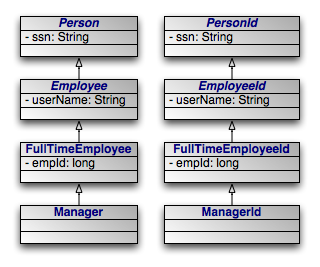 All entity classes related by inheritance must use the same identity class, or else each entity class must have its own identity class whose inheritance hierarchy mirrors the inheritance hierarchy of the owning entity classes (see Section 4.2.1.1, “Identity Hierarchies”).