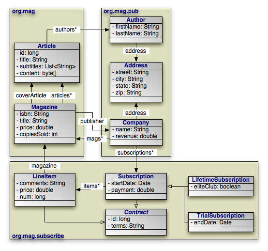 Through the course of this chapter, we will build a persistence metadata document for the model above. Our first step is to define the basic metadata structure using the elements we have examined so far: