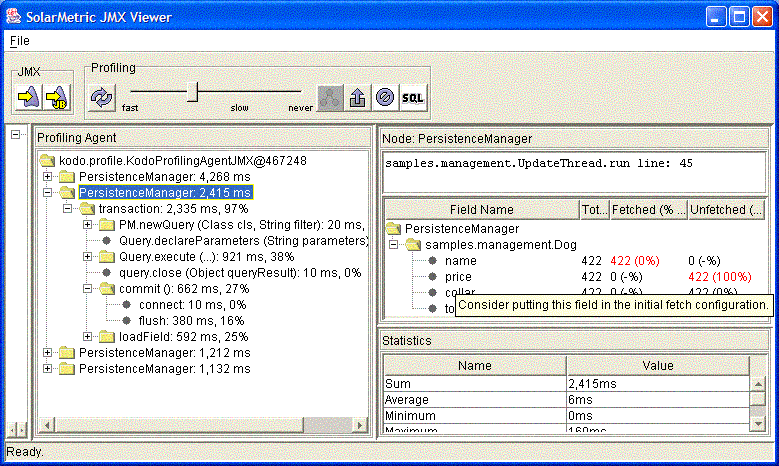 The MBean Panel contains a custom viewer when the profiling MBean is selected. This custom viewer contains the Kodo Profiling Console. Additionally, the console toolbar will have profiling toolbar options. Please see Chapter 13, Profiling for more information.