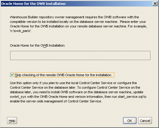 図2-7に示すダイアログが表示されます。「インストールのリモートOWB Oracleホームのチェックをスキップします。」を選択し、「OK」を選択します。