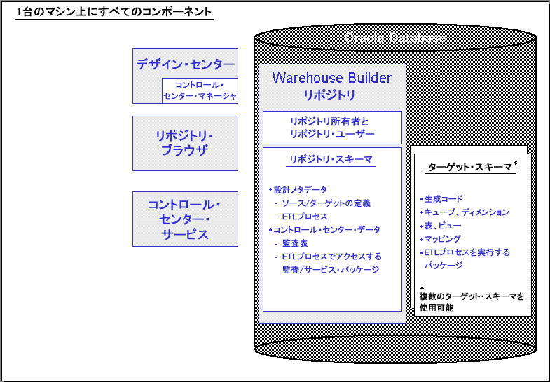 最も簡単に行えるインストールは、ローカル・コンピュータへの標準インストールです。標準のローカル・インストールでは、リポジトリ・アシスタントの手順に従って、1人のリポジトリ所有者と、配布ターゲットである1人のリポジトリ・ユーザーを割り当て、統合されたリポジトリを定義します。つまり、リポジトリ・ユーザーはETLプロセスを設計する場合はデザイン・センターにアクセスでき、配布と監査を行う場合はコントロール・センター・マネージャにもアクセスできます。