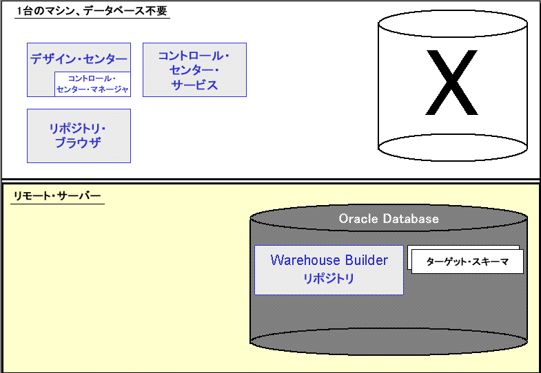 図2-1に、1台のラップトップ・コンピュータに行った標準インストールを示します。これは、クライアント・サイトでWarehouse Builderを使用するコンサルタントが、外出時に最小限のハードウェアを携帯する一般的なシナリオです。