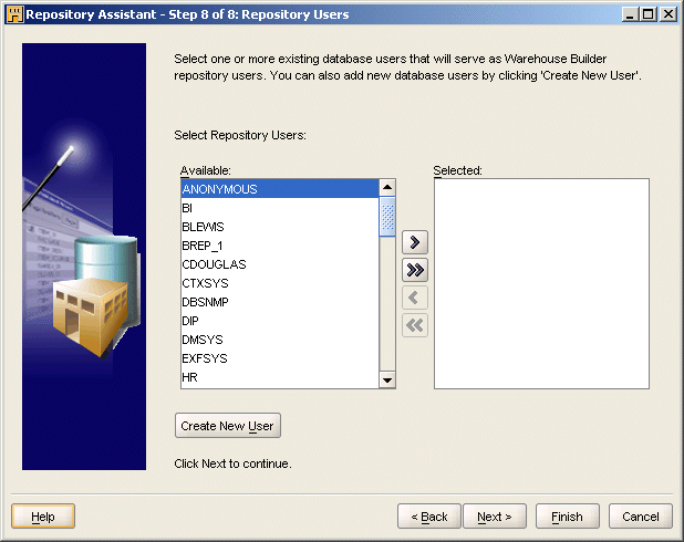 リストから選択する場合は、1人以上のデータベース・ユーザーを選択できます。ただし、セキュリティ上の理由から、SYSDBAのようなデータベース管理者ユーザーは、Warehouse Builderユーザーとして登録できません。