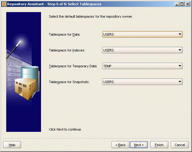 このウィザードを使用しない場合は、OMB Plusスクリプト言語を使用してリポジトリをインストールすることもできます。リポジトリを作成するデフォルトの設定は、OMB Plusを使用する場合でもリポジトリ・アシスタントを使用する場合でも同じです。たとえば、どちらの方法を選択しても、Warehouse Builderのデフォルトの索引の表領域にはUSERSが割り当てられます。スクリプト言語を使用したインストール方法の詳細は、『Oracle Warehouse Builder Scripting Reference』のOMBINSTALLコマンドの説明を参照してください。