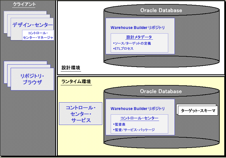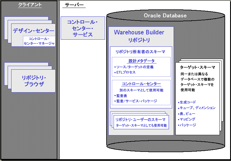 リポジトリは、1つに統合することができます。また、あるリポジトリに設計メタデータを格納し、別のリポジトリにコントロール・センター・サービスで生成されるランタイム・メタデータを格納するように、個別にリポジトリを定義することもできます。 ターゲット・スキーマをホスティングするサーバーごとにリポジトリをインストールします。必要に応じて、サーバー上に追加のWarehouse Builderコンポーネントをインストールせずにターゲット・スキーマを持つこともできます。 概要は、「Warehouse Builderのアーキテクチャとコンポーネント」を参照してください。例は、「拡張設定オプションを使用したリポジトリのインストール」を参照してください。 |