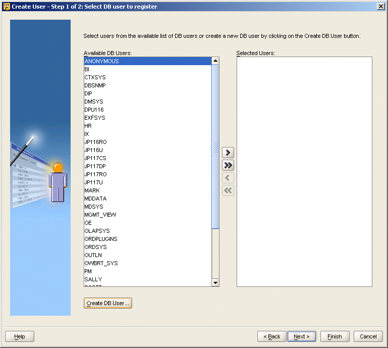 図7-2の左のパネルには、デザイン・リポジトリに定義されたOracle Databaseユーザーのリストが表示されます。このリストから既存のデータベース・ユーザーを選択するか、左下にある「DBユーザーの作成」をクリックし、新規ユーザーを定義してから登録します。
