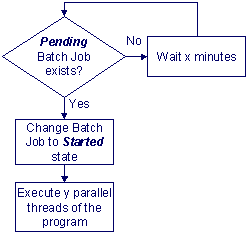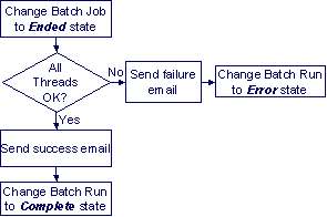 A PERL program runs in the background looking for Pending batch jobs and then executes them. When a batch job is executed, a batch run is created. The batch run keeps track of the overall status of the various parallel threads and it manages restart logic should the run fail. The following flowchart provides a schematic of this logic: