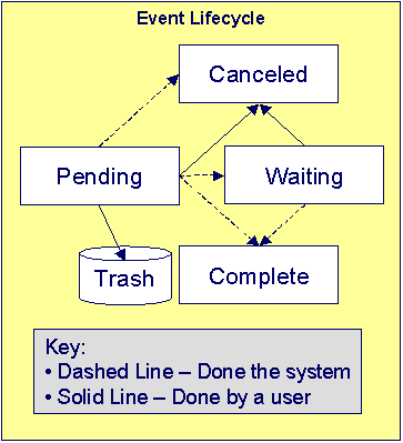 The Overdue Event Manager is a background process that activates overdue events on the appropriate date. On this date, the event's Activation algorithm(s) are called. This Overdue Event Manager also has the responsibility of recursively activating later events that are dependent on the completion of earlier events. |