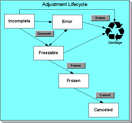 In the very rare situation when the system cannot generate the financial transaction because of inconsistent setup data, the adjustment is moved to the Error state. You may regenerate the financial transaction after correcting the source of the error. You may also delete such an adjustment.