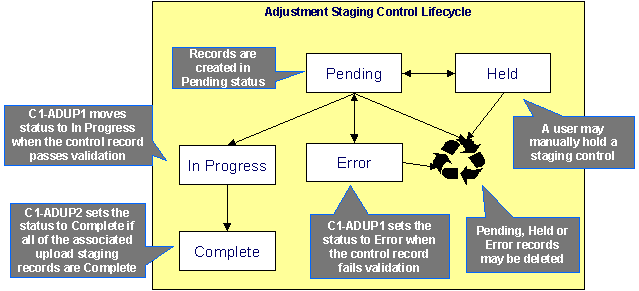· Held. The held status is available for situations where you want to prevent or delay the upload of a batch of adjustment staging records. The status may be set back to pending when the batch of records is ready for upload.
