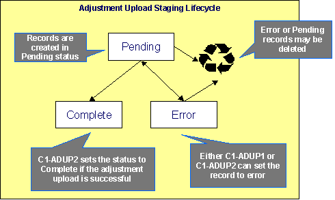 · Pending. Adjustment upload records are created in this state. The C1-ADUP2 process selects pending adjustment upload records and creates adjustments for each of them.