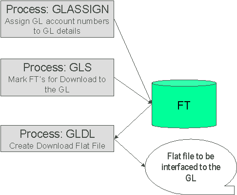 The GLS process creates FT download staging records for all FTs that are ready to be posted to the GL (the FT download staging records are stored on the FT/Process table). Each FT download staging record is marked with a batch process ID and run number.