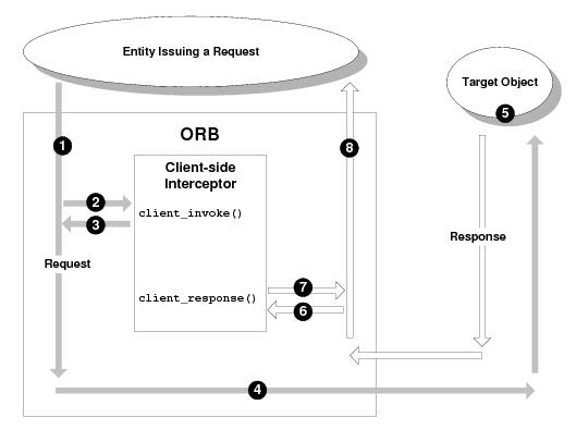 • client_response()—called when the response is returned back towards the entity making the request.The flow of execution of a CORBA application that uses a client-side interceptor is shown in Figure 1‑1. This figure shows a basic and successful request-response invocation cycle (that is, no exceptions are raised).Figure 1‑1 Client-side InterceptorIn Figure 1‑1, note the following events that are called out: