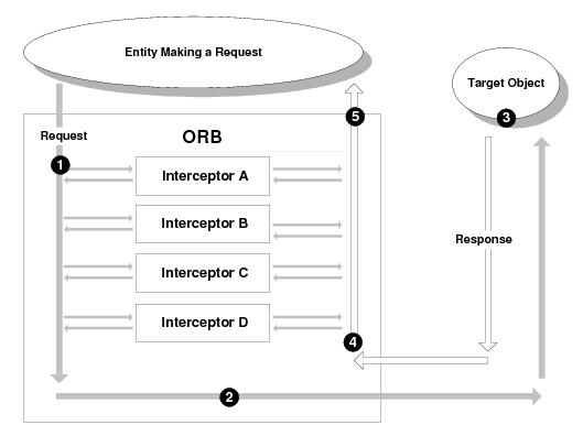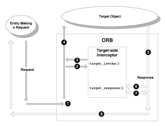 • As with the client-side interceptor processing, the ORB calls each target-side interceptor’s target_invoke operation in succession. If the return value INVOKE_NO_EXCEPTION is returned from each target_invoke operation, the request is passed onto the target object.Under the following circumstances, instead of calling the target_response operation on remaining interceptors back towards the client, the ORB calls the exception_occurred on those interceptors, and then returns an exception back towards the client application: