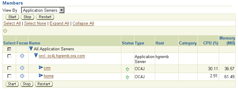 コマンドを使用して、構成を確認します。たとえば、Application Server Controlコンソールを使用して確認する場合は、「クラスタ・トポロジ」ページにナビゲートします。このページの「メンバー」セクションには、図6-7に示すように、3つのインスタンスがすべて表示されます。