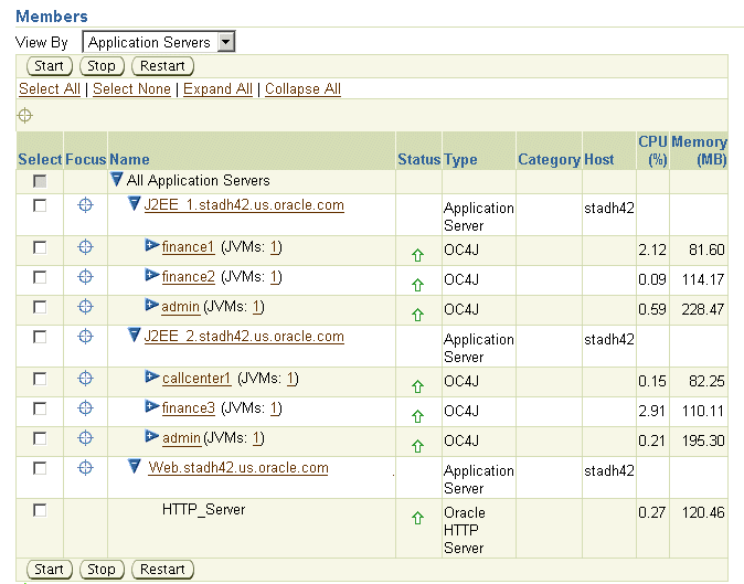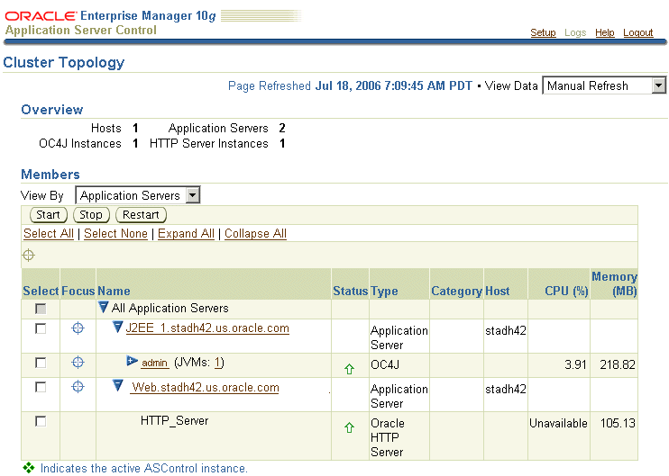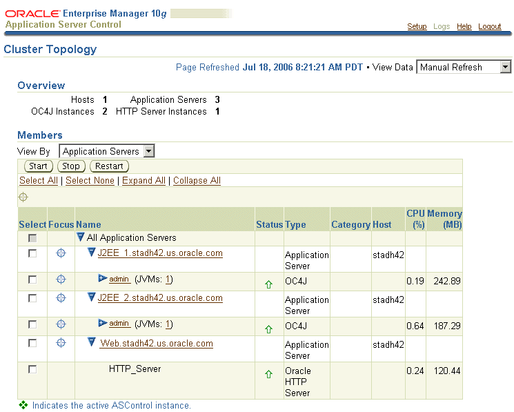ORACLE_HOME/opmn/bin/opmnctl @cluster status Processes in Instance: J2EE_1.stadh42.us.oracle.com ---------------------------------+--------------------+---------+--------- ias-component | process-type | pid | status ---------------------------------+--------------------+---------+--------- OC4JGroup:default_group | OC4J:admin | 21520 | Alive ASG | ASG | N/A | Down Processes in Instance: Web.stadh42.us.oracle.com ---------------------------------+--------------------+---------+--------- ias-component | process-type | pid | status ---------------------------------+--------------------+---------+--------- HTTP_Server | HTTP_Server | 25118 | Alive